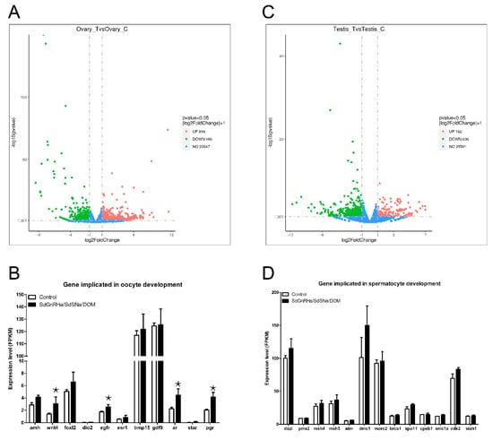 Transcriptome analysis of differentially expressed genes in the gonads of SdSNa/SdGnRHa/DOM injected S. dumerili (n = 3). (A) An MA plot showing the significantly downregulated (in green) and upregulated (in red) genes in the ovaries of injected females. (B) Genes implicated in oocyte development were upregulated after injection. (C) An MA plot showing significantly altered genes in the testes of injected males. (D) Genes implicated in spermatocyte development that were upregulated in the SdSNa/SdGnRHa/DOM injected S. dumerili. The * indicates statistically significant differences, p < 0.05.