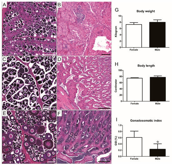 Micrographs of gonadal tissue sections sampled at three different growth stages from male and female S. dumerili, and the body weight, body length, and gonadosomatic index of sexually mature individuals were measured during the breeding season. (A) Oogonia and primary growth oocytes were detected in the ovaries of 2-year-old fish. (B) Spermatogonia and a few meiotic-stage spermatocytes were detected in the testes of 2-year-old males. (C) Perinucleolar oocytes as the most advanced stage in the ovaries of 3-year-old females during the non-reproductive season. (D) Although seminiferous ducts were observed at this time, no sperm was detected. (E) Vitellogenic oocytes in the ovaries of 3-year-old females in February. (F) On entering the reproductive season, the seminiferous ducts of male fish were filled with mature sperm. No significant differences were detected in the body weight (G) or body length (H) of male and female fish. The gonadosomatic index (I) of females was notably higher than that of males. Scale bar: 200 μm (A,C–F), 50 μm (B). The * indicates statistically significant differences, p < 0.05.