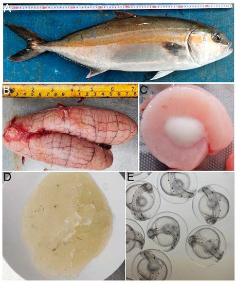 Hormonal treatments were used to induce the spawning of S. dumerili. (A) Body size of 3-year-old sexually mature greater amberjack. The ovaries (B) and testes (C) were sampled to assess the developmental and mature stages. (D) The fertilized eggs were collected and weighed. (E) The development of fertilized eggs into embryos.