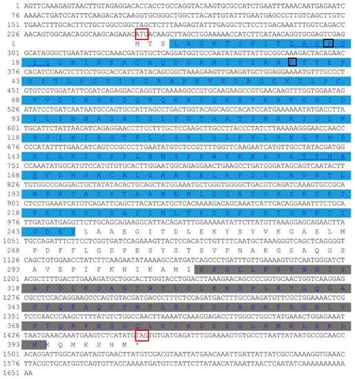 The similarity of this sequence to other known sequences was analyzed using the BLAST program (http://www.ncbi.nlm.nih.gov/BLAST/, accessed on 30 September 2021). The deduced amino acid sequence was obtained through the Expert Protein Analysis System (http://www.expasy.org/tools, accessed on 19 September 2021). The functional motif prediction in this sequence was performed using Motif Scan (http://www.hits.isbsib.ch/cgi-bin/PESCAN, accessed on 19 September 2021). The three-dimensional structure was analyzed using SWISS-MODEL (http://swissmodel.expasy.org/interactive, accessed on 27 May 2022). The sequence alignment was performed using ClustalW software (http://www.ebi.ac.uk/clustalW, accessed on 27 May 2022), and the phylogenetic analysis was conducted via Mega 5.0 software using the neighbor-joining algorithm. The tree topology was evaluated by 1000 replication bootstraps.