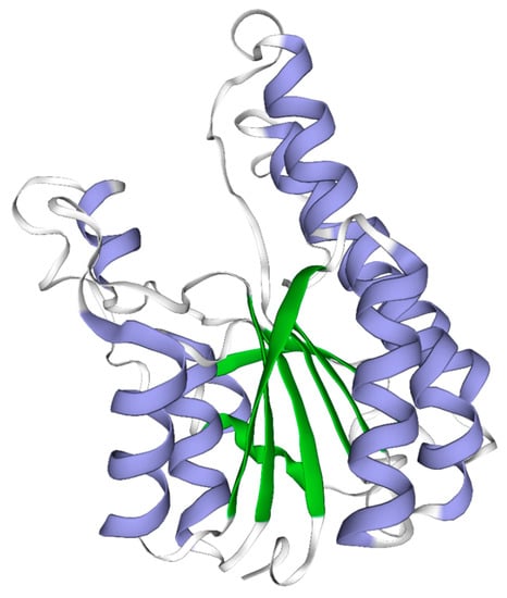 Prediction of the three-dimensional structure of the catalytic domain of P. aibuhitensis HSDL2. The beta strands are shown in green, helices are in blue, and the loop structure is shown in gray. The parallel β sheet is flanked by α helices.