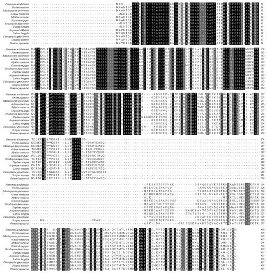 The HSDL2 protein sequences of 12 invertebrate species were selected to be aligned with P. aibuhitensis HSDL2. This protein sequence shared the highest similarity with scallop Pecten maximus L. (67.7%), and it shared 59.8–67.0% sequence similarity with other invertebrates and fishes (Figure 3). The N-terminal SDR domain of HSDL2 in different species is highly conserved compared to the high diversity of C-terminal.