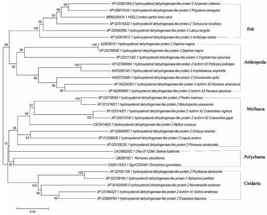Based on the alignment of the amino acid sequence, a phylogenetic tree was constructed. The result shows that the deduced amino acid sequence of P. aibuhitensis clustered mainly with invertebrates and was separated from vertebrates (Figure 4). The P. aibuhitensis HSDL2 was firstly grouped with polychaete D. gyrociliatus and Owenia fusiformis Delle Chiaje, and P. aibuhitensis HSDL2 was located closer to the Mollusca blade than to the Cnidaria blade. The HSDL2 homologs in Arthropoda were located closer to vertebrates than to other invertebrates.