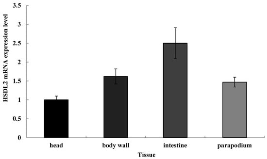 The gene expression of HSDL2 in different tissues of P. aibuhitensis was determined. Figure 5 shows that HSDL2 was expressed in all tissues with different levels. The expression level in the intestine was the highest, followed by that in the body wall and parapodium, and expression level in the head was the lowest.