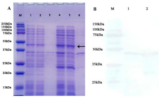 (A) SDS-PAGE; M-protein standards, 1—crude lysates of E. coli transfected with pET-28a, 2—lysate supernatant of E. coli transfected with pET-28a, 3—lysate pellet of E. coli transfected with pET-28a, 4—crude lysates of E.coli transfected with pET-28a-HSDL2, 5—lysate supernatant of E. coli with pET-28a-HSDL2, 6—lysate pellet of E. coli transfected with pET-28a-HSDL2; (B) Western blotting using anti-HSDL2 antibody; M—protein standards, 1 and 2—crude protein from untreated P. aibuhitensis.