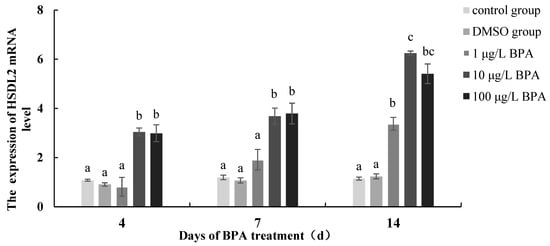 The HSDL2 mRNA expression pattern under BPA treatment in P. aibuhitensis. The relative expression level represented by mean ± standard error of mean (n = 4–6), significant differences in different treatment at each sampling time was indicated by different letter (p < 0.05).