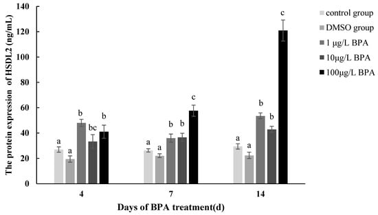 The HSDL2 protein expression pattern under BPA treatment in P. aibuhitensis. The protein expression level is represented by mean ± standard error of mean (n = 4–6); significant differences in different treatment at each sampling time are indicated by different letters (p < 0.05).