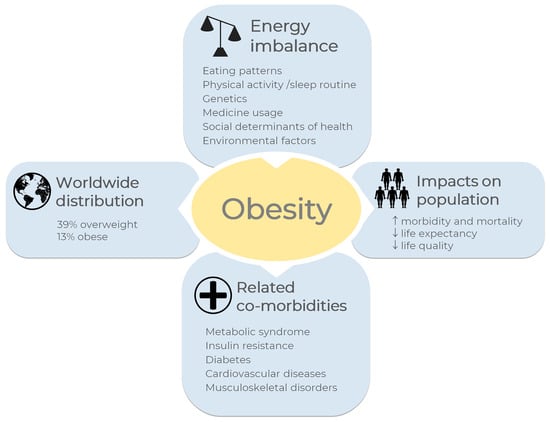 Morbidity and mortality associated with obesity have been related to a reduced quality of life, and it impacts life expectancy, as reviewed [2]. Comorbidities such as metabolic syndrome, insulin resistance, diabetes, cardiovascular diseases, musculoskeletal disorders, and some types of cancer are associated with obesity [1,3]. In general terms, obesity and overweight may be related to an energy imbalance between calories consumed and calories expended, which results in enhanced fat storage [1]. The overview of obesity in the world is shown in Figure 1. Some other factors are pointed out as obesity causes, including eating patterns, physical activity levels, sleep routine, genetics, medicine usage, and social determinants of health [1,3,4].