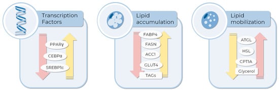 Lipolysis is the sequential hydrolysis of triacylglycerol (TAG) stored in cell lipid droplets [28]. Interestingly, it was found that CEBPA activates the transcription of a lipase during the differentiation of 3T3-L1 murine preadipocytes into adipocytes [29]. A low expression of classical lipases in human abdominal subcutaneous adipose tissue is accompanied by an increased expression of autophagy-related genes (ATGs) in overweight/obese subjects, which seems to be mainly related to glucose tolerance [30]. Some naturally derived compounds have been implicated in lipolysis and the reduction of adipogenic differentiation [31,32].