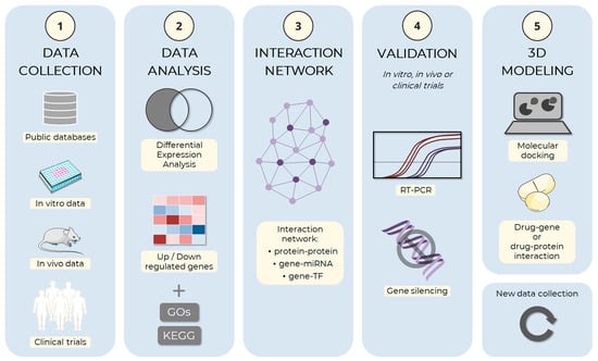 Figure 3. Schema of the adipogenesis in silico analysis pipeline. The computational simulation process of adipocyte development can be divided and implemented in an analysis pipeline. (1) The first step of the process is the collection of data on adipogenesis, including information about genes, proteins, and molecular mechanisms involved in the process. Data can be obtained from public databases, such as the Gene Expression Omnibus (GEO), ArrayExpress, and Sequence Read Archive (SRA), or from experimental approaches, such as in vitro and in vivo assays, or clinical trials, among others. (2) The collected data are analyzed to identify the genes and proteins involved in adipogenesis, the molecular mechanisms involved in the process and the regulatory factors, and which ones are up and down-regulated. During the gene expression analysis step, Gene Ontology (GO) and the Kyoto Encyclopedia of Genes and Genomes (KEGG) can be used to identify genes being expressed under different conditions and understand how these genes may be involved in adipogenesis processes. (3) After selecting the main factors, the hub genes are identified through the analysis of interactions between the factors: protein–protein interaction, target gene–miRNA interaction, or target gene–transcription factor (TF) interaction, among others. (4) Those with the highest degree of connections should preferably be selected for in vitro or in vivo experimental validation, which may use RT-PCR, gene silencing, or other techniques. (5) Finally, the main selected factors can be used from basic research to develop new drugs through 3D modeling methods, both the target (gene or protein) and small therapeutic molecules. The images were obtained and adapted from Servier Medical Art (http://smart.servier.com/, accessed on 22 December 2022), licensed under a Creative Commons Attribution 3.0 Unported License.