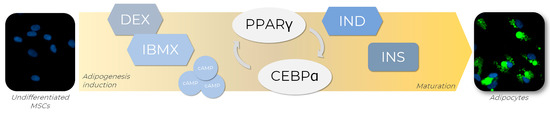 In order to generate adipocytes in vitro, a set of adipogenic inducers can be used to trigger the expression of several transcription factors known to regulate adipogenesis in vitro and the culture media combination of those inducers [77]. One of the most used adipogenic cocktails available is composed of dexamethasone (DEX), isobutyl-1-methylxanthine (IBMX), indomethacin (IND), and insulin (INS), each of these playing its role in adipogenesis (Figure 4). Firstly, the combination of DEX and IBMX activates PPARγ expression, which induces adipogenic differentiation [78]. DEX is a steroidal anti-inflammatory molecule, while IBMX is a nonselective phosphodiesterase inhibitor that acts by elevating the intracellular levels of cyclic AMP (cAMP) and protein kinase A (PKA), both signaling pathways required for transcriptional activation of PPARγ [77]. IND, a nonsteroidal anti-inflammatory exogenous ligand that enhances PPARγ expression, also promotes PPARγ activation, leading to the regulation of transcription factors from the CEBP family, such as CEBPA. Once activated, CEBPA forms a positive feedback loop with PPARγ, therefore upregulating each other’s expression levels [78]. Although not strictly necessary for adipogenesis initiation, INS plays a significant role in the late stages of differentiation by acquiring the metabolically active mature adipocyte phenotype. For example, a variety of paracrine and endocrine activities of molecules such as leptin and adiponectin, which are classically expressed in adipocytes, are insulin-regulated and, therefore, dependent on its presence for full maturation [79].