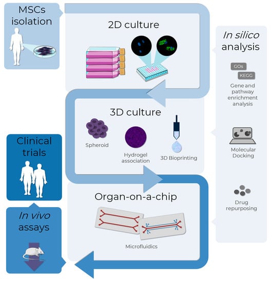 Another promising and innovative strategy that could help to improve the construction of 3D tissues is the 3D bioprinting technology. Briefly, bioprinting consists of fabricating a construct using a bioink (cells embedded in a hydrogel or other support components) to build an organ or tissue of interest with a specific structure and format [119]. Some studies used this approach to print adipose tissue, but usually, the focus is to generate adipose mimetic tissues for soft/adipose tissue regeneration. On the other hand, some works seek to understand whether MSC could be bioprinted in different materials with different stiffness and maintain their potential for differentiation [120,121,122,123]. However, it is possible to learn from these approaches and apply them in other contexts, such as drug research.