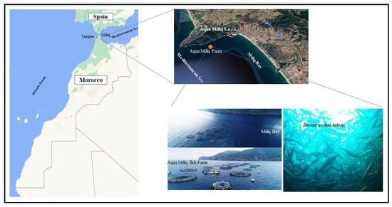 Our study was carried out on 48 fish of European sea bass in intensive farming conditions, (24 fish per age group; 12 fish presenting each stress state). Two groups of fish were studied; the first group having had a one year stay and the second group having had two years’ stay at the same fish farm. The fish were caught randomly on the day of sampling operation from two different floating circular cages at the Aqua M’diq fish farm, located in the M’diq Bay on the Moroccan Mediterranean coast (Figure 1). The characteristics of the farm site have been accurately described by recent studies [18,19].