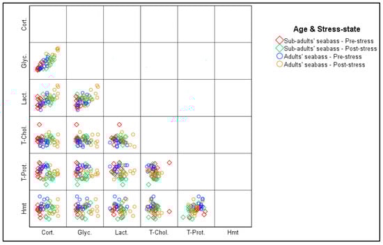 Linear correlation matrix between the evolution of physiological stress biomarkers in sea bass individuals (N = 48) according to age and the stress states during the sampling operation at M’diq Bay (Cort.—Cortisolemia; Glyc. —Glycemia; Lact. —Lactatemia; T.Chol. —Total Cholesterol; T.Prot. —Total Proteins; Hmt. —% Hematocrits).