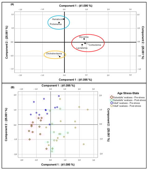 Principal component analysis representing the mean total (A) and individual concentrations (B) of blood indicators in subadult and adult Dicentrarchus labrax in pre- and post-stress states.