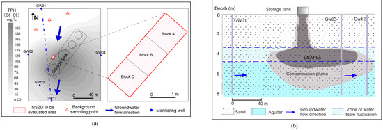 The characteristics of the study area and LNAPL contamination. Plot (a) shows the sampling location, groundwater flow direction, and the TPH contaminant concentrations (as represented by the concentration contour plot). The red rectangle near the storage tanks (i.e., block A, B, and C) represents the area where NSZD was evaluated. The three red triangles in the non-contaminated area, north of the storage tanks, represent the background sampling points. Plot (b) shows the vertical distribution of the LNAPLs and contamination plume.