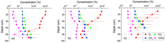 Vertical profile of soil gas O2, CO2, CH4, and VOCs calculated in the study area. Some missed data points at 70~90cm indicated that the concentrations were greater than the upper limits of detection. (a–c) Plots represent the A, B, and C blocks in the contamination source area, respectively.
