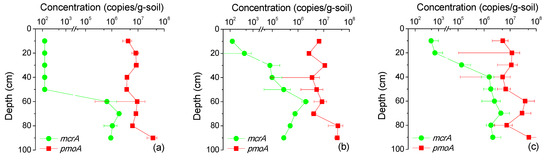 Vertical profile of pmoA and mcrA gene abundance in the study area. The (a–c) plots represent the A, B, and C blocks in the contamination source area, respectively.