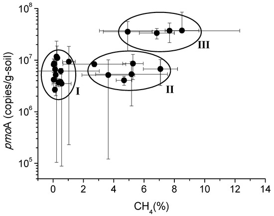 The concentration of the pmoA gene, encoding methane monooxygenase, did not vary as dramatically as the mcrA gene (Figure 4). The correlation analysis results showed that the pmoA gene had a significantly negative correlation with O2 (r = −0.526, p = 0.005) and a positive correlation with CH4 (r = 0.669, p < 0.001). As Figure 5 illustrates, CH4 and the pmoA gene were not linearly correlated. The relationships can be divided into three circumstances: (I) low CH4 and low-to-middle pmoA, corresponding to the samples collected from the surface or near the surface; (II) middle CH4 and middle pmoA, correspondng to the samples collected from the intermediate depth (about 30–80 cm); and (III) high CH4 and high pmoA, corresponding to the samples collected from the deep depth (greater than 60 cm). There was no significant difference between pmoA concentrations in group I and group II (p < 0.05), indicating that the CH4 oxidation rates in these areas were basically invariant, while the pmoA concentrations in group III were significantly higher.