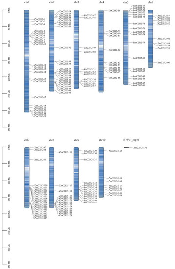 Location of the ZmC2H2 members. The black line on the left measures the chromosome’s length, each column of different lengths represents chromosomes Chr1 to Chr11, and “B73V4_ctg40” represents the splices. The density of the line of the column represents the density of the genes on the chromosome.