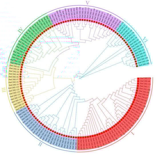 Six subfamilies were divided among the protein sequence’s fourteen members using MEGA X, and the method of division was as per that for C2H2 members in a previous report [46]. Subfamily I had the most members of ZmC2H2, at 40 members, while only 17 members were in subfamily III (lowest number). Subfamily II and V had a similar number of ZmC2H2 members, at 26 and 27, respectively (Figure 2).