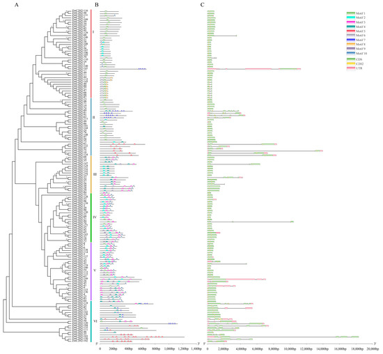 The motifs were identified in ZmC2H2, and the kinds and order, according to the evolutionary relationships, are shown in Figure 3A and Table S2. Each subfamily of ZmC2H2 members had similar kinds of motifs. Motif 5 was only found in subfamily II and subfamily VI, and motif 4 did not exist in subfamilies I and II, while motif 6 was only found in subfamily I. The gene structures of the ZmC2H2s were also analyzed, and the results are shown in Figure 3C, where the structure of the different ZmC2H2s showed great variation. Here, ZmC2H2-103 had the longest length, and members of the same subfamily had a similar gene structure according to the analysis.