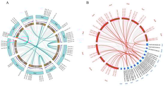 Collinearity of the ZmC2H2 members. (A) Collinearity of the ZmC2H2s, where the two circles in the middle represent the gene density, the green lines represent collinear gene pairs, and the gray background represents all of the collinear pairs of genes in maize; (B) collinearity of ZmC2H2s with members in rice, where the red lines represent collinear gene pairs, and the gray background represents all of the collinear pairs of genes between two species.