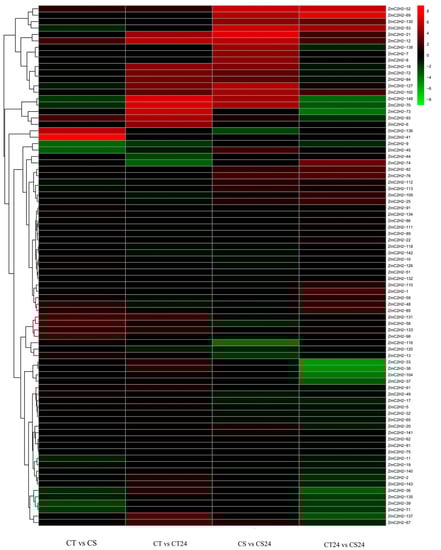 The transcriptome data of the cold-tolerant materials and the cold-sensitive materials under cold stress were analyzed to obtain a heat map of the expression pattern of the ZmC2H2 gene family (Figure 5). The results show that, under cold stress, the expression of the ZmC2H2 gene was significantly different between the different materials and between the different treatment times of the same material, indicating that the ZmC2H2 gene can be induced by low temperatures. Under cold stress, 69 genes in the ZmC2H2 gene family were not expressed, and the other 81 genes were expressed. The change in the expression of the ZmC2H2 genes in CT was more significant than that in CS, and the expression of the up- and downregulated genes in CT24 was relatively higher.