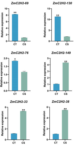In order to verify the expression of the C2H2 gene family under cold stress, we selected the following three candidate genes involved in different pathways: auxin response gene (ZmC2H2-69 and ZmC2H2-130); exogenous stress response gene (ZmC2H2-76 and ZmC2H2-149); and light response gene (ZmC2H2-33 and ZmC2H2-38). From the results, we can see that the expression of the genes changed before and after the treatment of the leaves. The results show that ZmC2H2-69, ZmC2H2-130, and ZmC2H2-76 were significantly upregulated, and that ZmC2H2-149, ZmC2H2-33, and ZmC2H2-38 were significantly downregulated (Figure 6). It is hypothesized that these genes, which function in different metabolic pathways, may play a key role in the maize cold response, and can be further investigated as candidate genes.