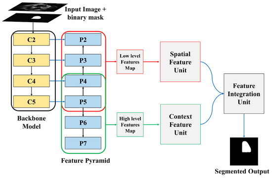 The proposed LV segmentation model is shown in Figure 1. The training images along with binary masks are transmitted to the backbone model and feature pyramid network, which extracts both low-level and high-level image features using the binary mask of training images. The spatial feature and channel feature modules, respectively, process these low-level and high-level retrieved features. The output of these two modules is then processed by the feature integration unit, which outputs the segmented LV. The following sections explain the entire process in detail.