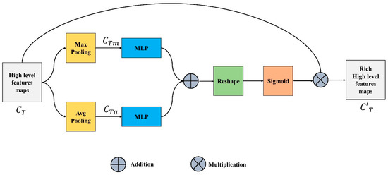 The maximum and average pooling not only successfully learns the extent of the desired object but also acquires crucial information about the object’s specific characteristics to estimate finer channel-wise attention. The and are fed to a multi-layer perceptron with one hidden layer. This MLP is simply a fully connected layer and the output generated is shown in Equations (7) and (8).