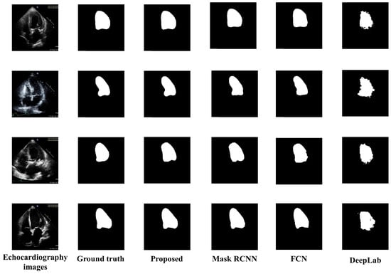 Figure 5 presents the visual results of the segmented output of all models. Original echocardiography images are in the leftmost column, and the ground truth labels are next to them. The segmented outputs of the proposed model, Mask RCNN, FCN, and DeepLab, are also depicted in column 3, column 4, column 5, and column 6 of Figure 5 respectively. DeepLab segmentation accuracy is not good enough, especially since the borderlines are inaccurate. The Mask RCNN and FCN border lines are quite precise; however, the shape of LV is not as accurate as the proposed model. The proposed model provided a highly accurate representation of the LV’s form as well as its correct contour.