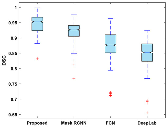 In addition to this, the statistical analysis of the evaluation metrics is also presented. A boxplot was used to analyze and compare the distribution of evaluation metric values for all test images. Figure 6 depicts a boxplot of DSC values for test images. The proposed model outperforms competing segmentation methods in terms of the minimum and maximum value, the median, and the upper and lower quartiles. Similarly, the suggested model exhibits fewer outliers than the other models, indicating that its performance is consistent over the entire test dataset.