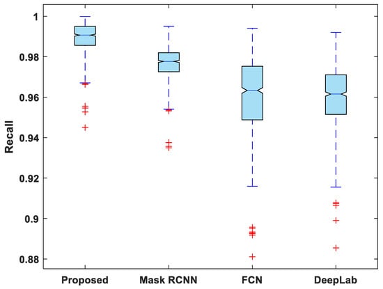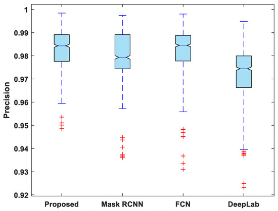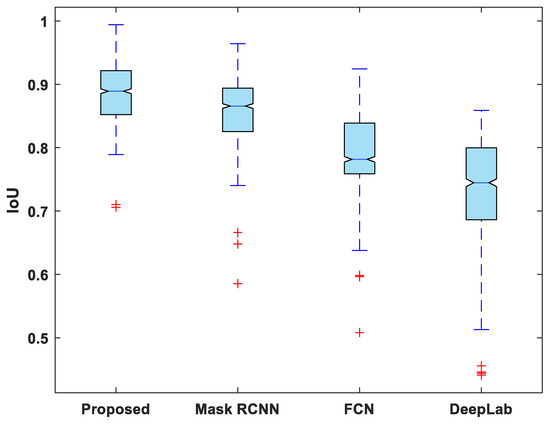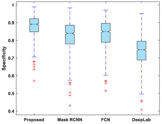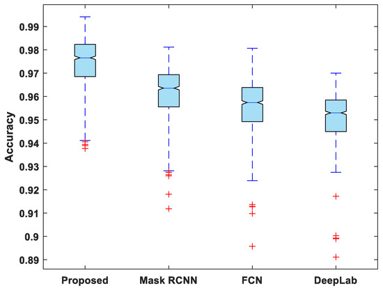Figure 7, Figure 8, Figure 9, Figure 10 and Figure 11 display boxplots for IoU, accuracy, recall, precision, and specificity, respectively, from which it can be inferred that the behavior of the proposed model for these metrics is fairly similar to that of DSC. Furthermore, the proposed model’s higher performance is also demonstrated by the lower skewness of the boxplot compared to the skewness of boxplots for the other models.