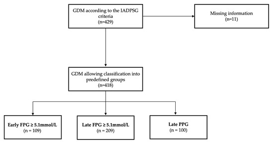 The present study aimed to assess whether different ways of diagnosing GDM (Groups: early FPG, late FPG and late PPG) are able to identify women with different anthropometric phenotypes at the time of diagnosis. Another objective was to determine whether different ways of diagnosing GDM in these women are associated with differences in the course of pregnancy and the incidence of neonatal complications.