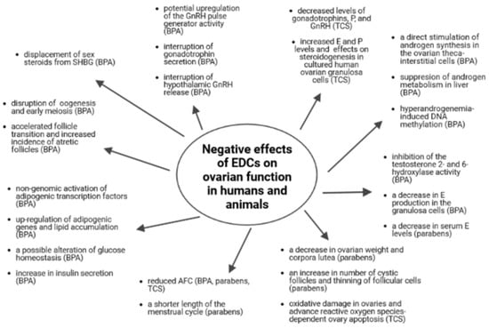 The possible effects of endocrine disrupting chemicals—bisphenols, parabens and triclosan—on ovarian function in humans and animals are summarized in Figure 1.