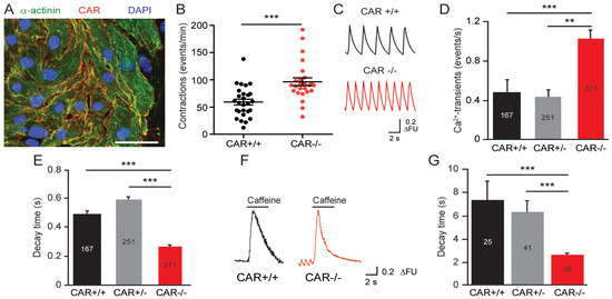 Surprisingly, CAR-deficient cardiomyocytes showed increased beating frequencies (96 ± 7 bpm) compared to WT cardiomyocytes (59 ± 5 bpm, Figure 1B). In line with these measurements, CAR KO cardiomyocytes exhibited significantly increased spontaneous calcium cycling, which correlated with a faster decline of individual calcium transients (Figure 1C,D). The calcium transients for CAR KO cells consistently showed significantly shorter decay time constants compared to WT calcium transients (Figure 1E). In addition, we observed significantly decreased decay time constants in mutant cardiomyocytes after caffeine application, which triggers a complete release of calcium stored in the sarcoplasmic reticulum (Figure 1F,G). Caffeine-induced transients are long-lasting in comparison to spontaneous calcium transients.