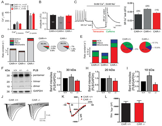 Calcium extrusion is enhanced in CAR knockout cardiomyocytes, which correlates with the increased beating frequency. Calcium extrusion is enhanced in CAR knockout cardiomyocytes, which correlates with the increased beating frequency. (A) Intracellular calcium concentrations at diastolic and systolic phases of wild type, heterozygote, and CAR-deficient cultured cardiomyocytes are depicted. (B) Amplitudes of calcium transients after the application of 10 mM of caffeine, which might be considered a measure of calcium levels stored in the sarcoplasmic reticulum. No differences were observed between the different genotypes, suggesting that similar amounts of calcium are stored in the sarcoplasmic reticulum. (C) Spontaneous calcium events via the RyR, so-called calcium leaks, can induce spontaneous beating and fibrillation of the heart [42,52,53]. The Ca2+ leak can be quantified by measuring the changes of cytosolic Ca2+ in the presence of 1 mM of tetracaine (RyR inhibitor) in Na+- and Ca2+- free ACSF. Tetracaine completely blocked the RyR and, therefore, the SR Ca2+ leak, consequently, the cytosolic Ca2+ concentration decreased. Wild type and CAR knockout cardiomyocytes did not show any significant difference in the intracellular Ca2+ drop. Further control at the end of the experimental caffeine was applied to the cells, which induced a complete SR release of Ca2+. There was no difference in the Ca2+ transient amplitude between wild type and CAR knockout cardiomyocytes. (D) Rate constants for all four calcium extrusion components were calculated for spontaneous calcium transients (for calculations, see Supplementary Material). SERCA2 and NCX showed significantly increased rate constants in CAR knockout cardiomyocytes. The relative amounts of calcium removed by the different mechanisms are shown for both genotypes in percentages at the right. (E) In caffeine-induced calcium transients, the NCX rate constants were significantly increased in CAR knockout cardiomyocytes compared to CAR wild types. The relative amounts of calcium removed by the different mechanisms are shown for both genotypes in the percentages. (F–I) Western blot analysis of the band intensities of phospholamban (PLB) did not show any differences between CAR wild type and knockout E10.5 hearts. Quantification of band intensities of the pentamer (G), trimer (H), and dimer (I) were calculated. Since the regulation of SERCA2 by phospholamban might affect the beating frequency, we analyzed the polypeptide composition of phospholamban in the absence of the CAR. The interaction of phospholamban with SERCA2 negatively regulates calcium removal from the cytosol. Phosphorylation of phospholamban by PKA results in a release of the monomers from SERCA2, which then reassemble into di-, tri-, or pentamers [50,51]. (J–L) Sodium currents are not altered in CAR-deficient cardiomyocytes. Single traces (J), the current/voltage relationships (K), and the summary (L) of whole-cell patch clamp recordings of cultured cardiomyocytes are depicted.