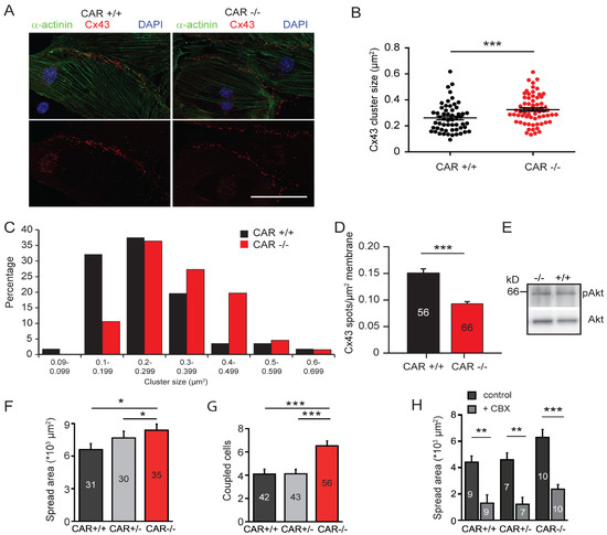 The sizes of connexin43 spots and dye coupling are increased in the absence of the CAR. (A–D) Quantification of connexin43 spots at cell–cell contact sites of cultured E10.5 wild type and CAR-deficient cardiomyocytes. Cells were stained by rabbit anti-connexin43, mAb anti-sarcomeric actinin, and DAPI. The average sizes of connexin43 clusters increased; (B) data are from three independent cultures, Mann–Whitney test p = 0.0007. In total, 56 wild type and 66 knockout cardiomyocytes were analyzed. Roughly 20 spots per cell were counted and the average size per cell was calculated. (C) The size distribution of connexin43 plaques shows a shift toward a larger cluster while smaller ones are reduced (chi-square test p = 0.0182). (D) The total number of connexin43 plaques per cell–cell contact area was reduced. (Mann–Whitney U test p < 0.001). Scale bar in A, 50 μm. (E) Western blot of wild type and CAR-deficient embryonic hearts using antibodies to the phosphorylated Akt (pAkt) or total Akt (lower panel) are shown. (F,G) Individual cardiomyocytes from the E10.5 CAR wild type and CAR knockout cultures were injected with Lucifer Yellow and the spreading was examined after 5 min. The spread area (F) and the number of coupled (Lucifer Yellow stained) cardiomyocytes (G) were significantly increased in CAR knockout cultures. (H) Lucifer Yellow spread was blocked by the gap junction blocker carbenoxolone (CBX) at 200 μM. (* p < 0.05, ** p < 0.01, *** p < 0.001).