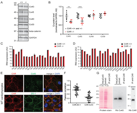 Decreased expressions of connexin43 and 45 in CAR-deficient embryonic hearts. (A,B) Expressions of connexin43, 45, 40, and 50 in wild type and CAR-deficient E10.5/E11.5 hearts shown by Western blots. For comparison, β-catenin and GAPDH are shown (from top to bottom). Band intensities from blots were quantified. Reductions were observed for connexin43 and 45 (t-test p = 0.0095 and p < 0.0001, respectively) but not for connexins 40 or 50 (t-test 0.5773 and 0.1179, respectively) in knockouts. Individual hearts were directly solubilized in the SDS-PAGE sample buffer. Molecular mass markers are indicated on the left of the panel. AU, arbitrary units. (C,D) Selected Affymetrix microarray data of mRNA expression levels of connexins and cell–cell contact proteins of E10.5 hearts of wild type and CAR-deficient mice did not reveal differences. For further details, see Table S1 and the database entry (GEO GSE138831). (E,F) On E10.5 cardiomyocytes, the CAR was not found to co-localize with connexin43. ZO-1 is shown for comparison. Scale bar, 10 μm. The Pearson correlation of co-localization was calculated using Fiji/Image J software (F); 48 and 43 images were analyzed for CAR-ZO-1 and CAR-Cx43 co-localization, respectively. (G) No co-immunoprecipitations of connexin43 and CAR were detected. (** p < 0.01, *** p < 0.001). The CAR was precipitated from extracts of HeLaCx43 by the IgG fraction of rabbit 80 (anti-CAR) directly coupled to CNBr-activated beads. The left panel shows the detergent extracts of HeLaCx43 cells stained by Ponceau. (Please note that this protein stain is not sensitive enough to detect proteins obtained by immunoprecipitation). The middle pellet shows the blot with anti-Cx43 of the HeLaCx43 extract and the IP with anti-CAR. No connexin43 could be detected; however, the CAR was easily visualized in the IP (right panel). A total of 7 mg of total protein of the HeLaCx43 extract and 20 μg IgG were used in the IP.