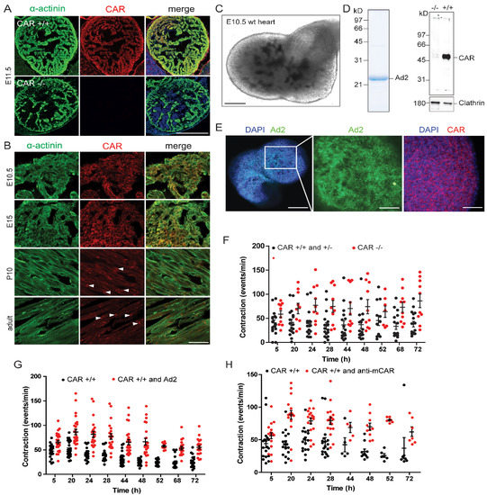 In the embryonic heart, the CAR is expressed on the surfaces of all cells (Figure 5A,B), but at postnatal stages, becomes predominantly restricted to the intercalated discs (Figure 5B, depicted by arrowheads) (for further postnatal stages, see [25]). To extend our observations of the increased beating activity of CAR-deficient cardiomyocytes in monolayers, we cultured intact E10.5 hearts from the littermates of WT or CAR-deficient mice in Matrigel on chamber slides for up to 72 h, and the frequency of beating was determined at different time points (Figure 5C). In addition, we applied polyclonal antibodies to the extracellular domain of the CAR or “fiber knob” to explant cultures. Both reagents are known to disrupt cell–cell contacts in neurons [3]. “Fiber knob”, here referred to as Ad2, is the tip of the homotrimeric protein of the fiber from the adenovirus capsid, which binds the CAR on the host cell surface for the infection (Figure 5D,E,G). Ad2 binds up to three D1 polypeptides of the CAR [57,58] with an affinity higher than CAR to itself and interferes with the cell–cell contact formations of epithelial cells and neurons [3,59]. It interacts specifically with the CAR but not with the highly-related proteins CLMP and BT-IgSF (Supplemental Figure S3) [60].