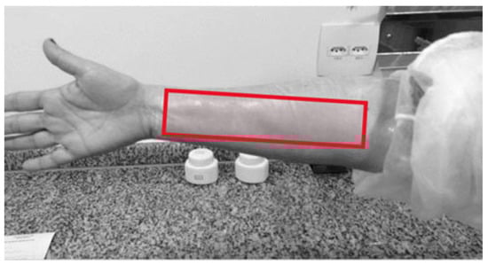 The sample dose was applied to an equivalent proportional area of the forearm of each volunteer calculated using the formula {[(M1 + M2 + M3 + M4)/4 × C]/600 × 2} where: M1 is the circumference of the forearm at the wrist (cm); M2 and M3 the two equidistant measurements of the circumference of the forearm between the elbow and wrist (cm); M4 the circumference of the forearm at the height of the elbow (cm) and C the length of the forearm (cm). Figure 1 indicates that areas of the forearms were marked ready for application of the test formulation.