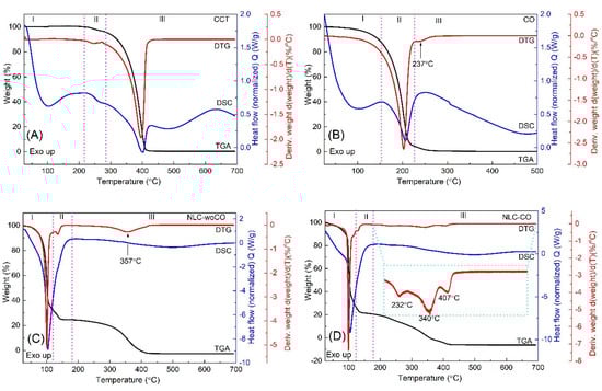 The TGA/DTG and DSC curves of (A) caprylic acid triglyceride (CAT), (B) CO, (C) NLC, and (D) NLC-CO are shown in Figure 3, and data extracted from the curves are summarized in Table 6.