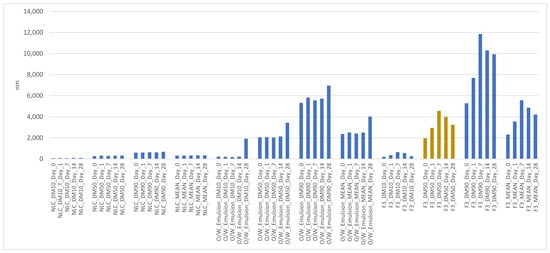 Relative to the mean particle size in F3 (10% CO/NLC-CO 1:1 in O/W emulsion), the incorporation of the oil caused an increase in the size of the nanoparticles (first peak indicated on day 28) and in the average size of the emulsion (the second peak indicated on the day 28) compared to the formulations without the incorporation of the oil (emulsion O/W) []. With the stabilization of the emulsifying system and after the days, the oil tended to migrate from the internal phase of the NLC to the external phase of the system, resulting in an increase in the particle size of the incorporated active [].