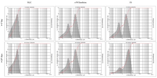 Histograms representing particle size analysis by laser diffraction day 1 and 28 distribution profiles of NLC, O/W emulsion, and F3 at room temperature.