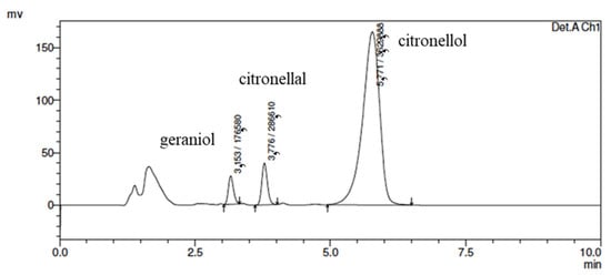 The HPLC analytical method presented a total running time of 10 min, with elution of geraniol, citronellal, and citronellol at 3.15, 3.77, and 5.77 min, respectively, as shown in Figure 6:
