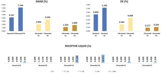 It was noted in the first 3 h of the test that citronellol and citronellal markers were not detected in the recipient liquid in both formulations F1 and F3. It is known that citronellal has a higher volatilization rate than the other two markers [] and is likely to have evaporated rapidly rather than being absorbed into or remaining at the skin surface. In addition, it was noted that the citronellol marker had a higher percentage in the receptor fluid from 3 h onwards in both F1 and F3 compared to the other markers. It is possible to suggest that this occurred due to the physicochemical property of citronellol, in which it presents a higher log P and may have been absorbed into the lipid-rich stratum corneum but slowly permeated deeper into the skin tissues before partitioning into the receptor solution.