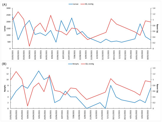 Saturation deficit (SD mmHg) of the tropical dry forest in relation to the abundance of ticks collected between February 2021 and February 2022 for (A) larvae, (B) nymphs.