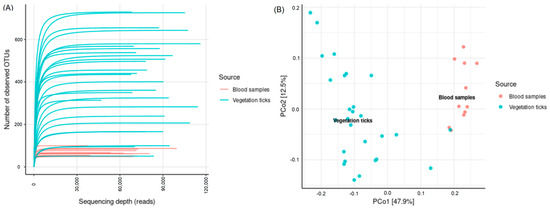 A total of 6897 ASVs were generated and assigned to a taxonomic rank. Rarefaction curves were generated to evaluate if the depth of sequencing was sufficient to capture all diversity in the samples. Figure 2A shows that the number of observed ASVs for all samples levels off before sequencing depth is lost. There are notable differences between blood and vegetation samples in terms of the number of ASVs observed. The number of ASVs from blood samples is not as big as for ticks collected from vegetation, and the blood samples’ display less spread.