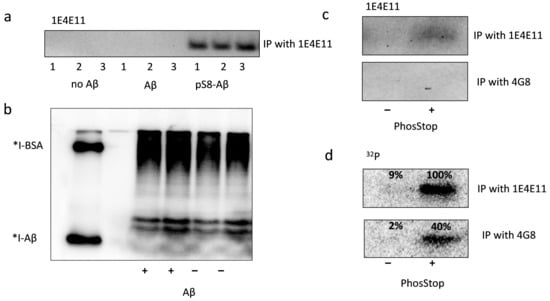 Phosphorylated Aβ in cell lysate (a,b) and in the extracellular medium (c,d) of HEK293 cells treated with exogenous Aβ. The extracellular medium and lysate were enriched for pS8-Aβ using IP with 1E4E11 antibodies (“IP with 1E4E11”) or for total Aβ using 4G8 antibodies (“IP with 4G8”). Photographs of nitrocellulose membranes after Western blotting, incubated with antibodies to pS8-Aβ (“1E4E11”) (a,c), and fragments of an autoradiograph after SDS-PAGE (“32P”) are shown (b,d). The numbers on the autoradiograph (d) indicate the relative intensity of the corresponding bands on WB. *I-Aβ, *I-BSA are radioiodine-labelled bovine serum albumin (BSA) and Aβ, respectively.